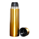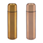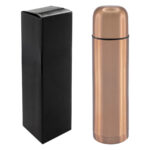 Termo metálico encobrizado de 1/2 litro, tapa con dosificador. Presentación en estuche de cartón laminado negro.