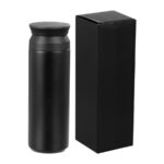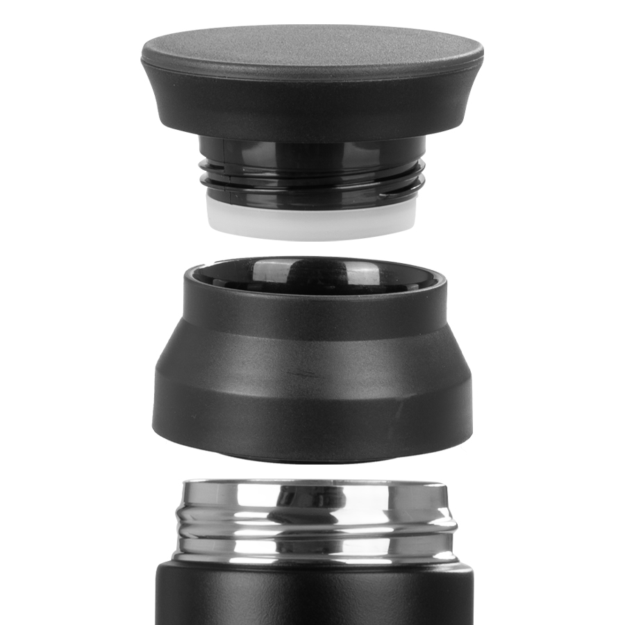 Botella térmica metálica doble pared aislante, cubierta de Polipropileno (PP) acabado mate, interior Acero inoxidable 304 SS, exterior Acero inoxidable 201 SS, modelo «SMART LID». Incluye doble tapa rosca de plástico PP negro, con sello cilíndrico de silicona, sistema de filtro circular y termómetro digital en la tapa superior, que marca la temperatura del líquido interior. Capacidad 480ml. Producto BPA FREE, para el contacto con líquidos y alimentos. Presentación en bolsa plástica transparente + caja de regalo de cartón laminado negro.