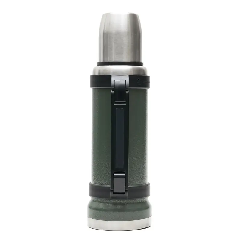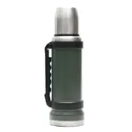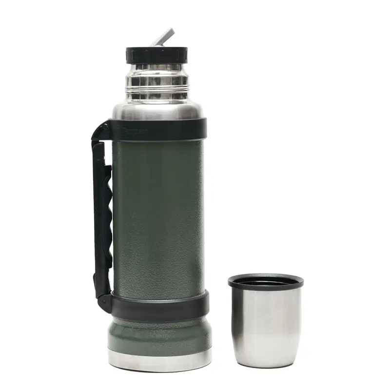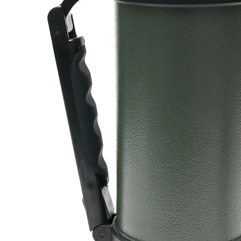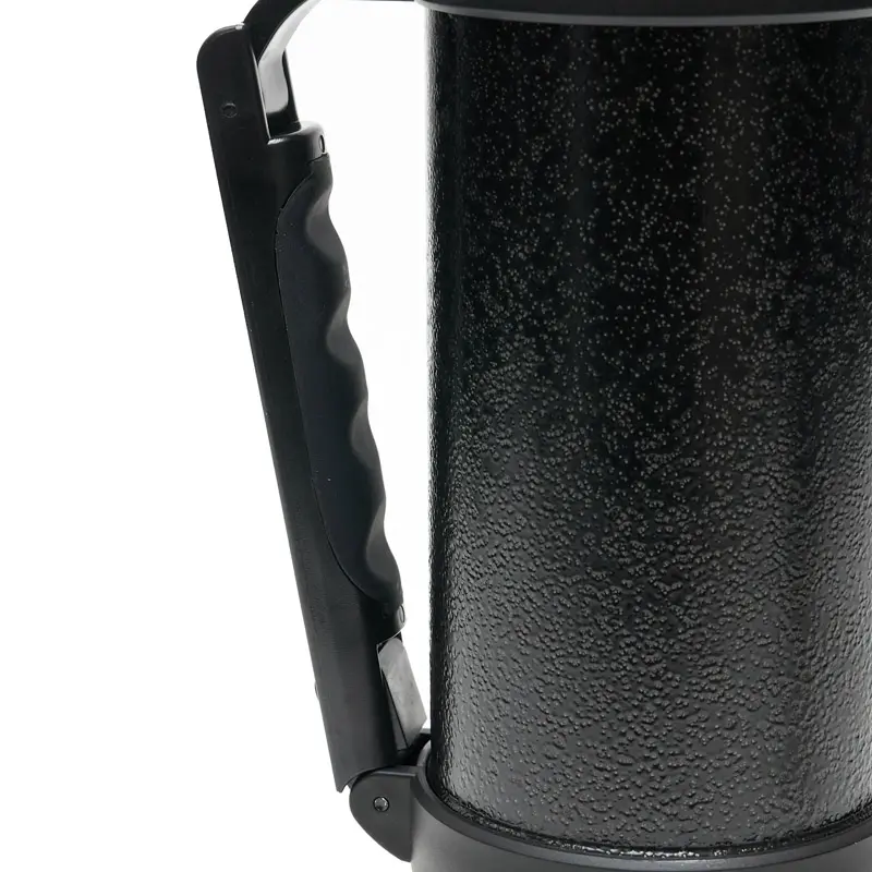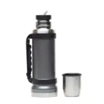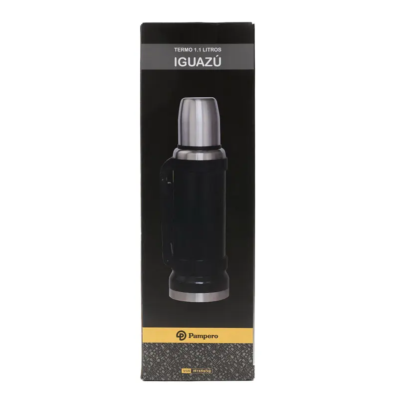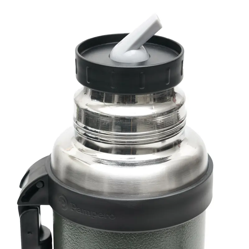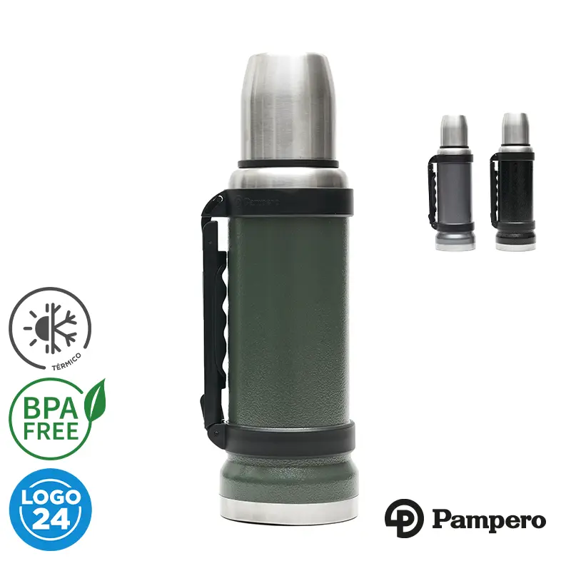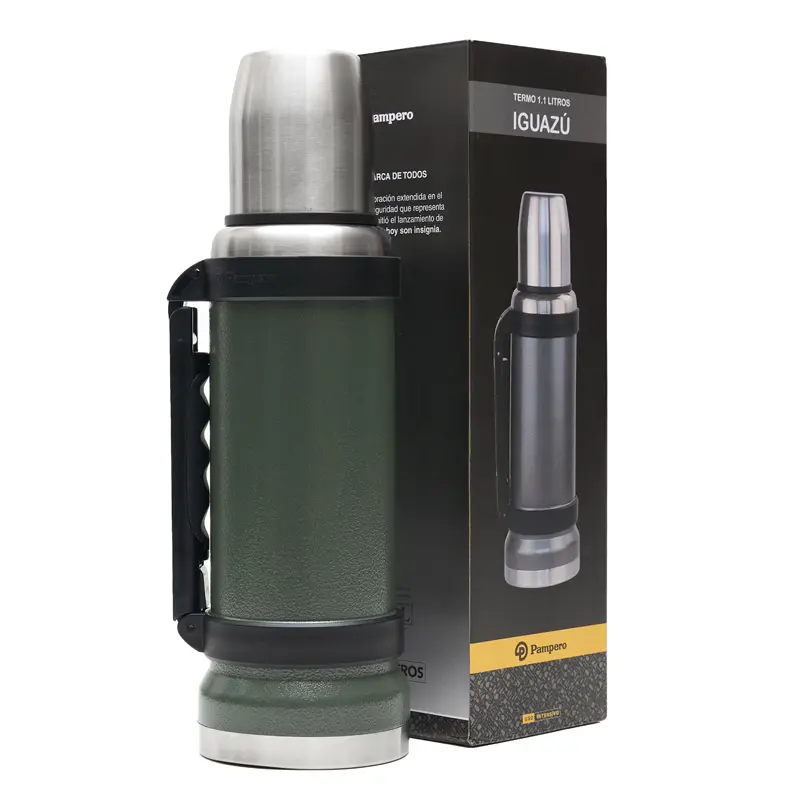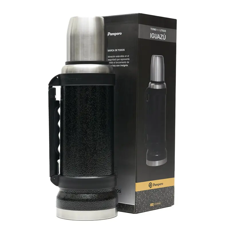 Termo de acero inoxidable 304, recubierto con esmalte especial que protege de ralladuras y golpes. Puede mantener el contenido a la misma temperatura durante 18hs, gracias a su doble pared aislante especial de acero. Cuenta con un tapón cebador Hermético a rosca con la función anti derrame y tapa con superficie plana estable para usar como taza o vaso y manija plegable para facilitar el transporte. Presentado en caja de cartón.