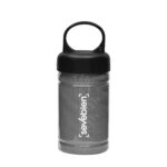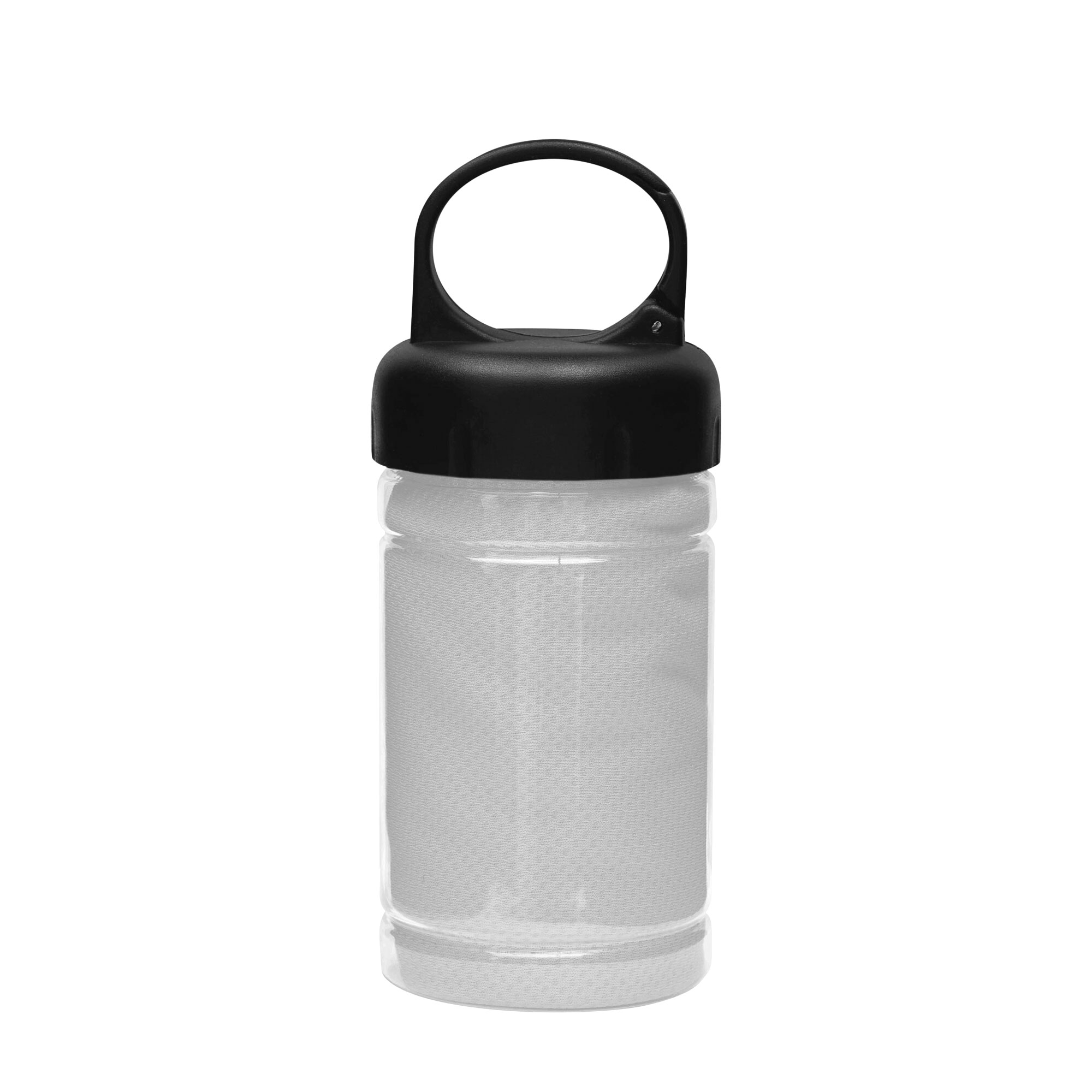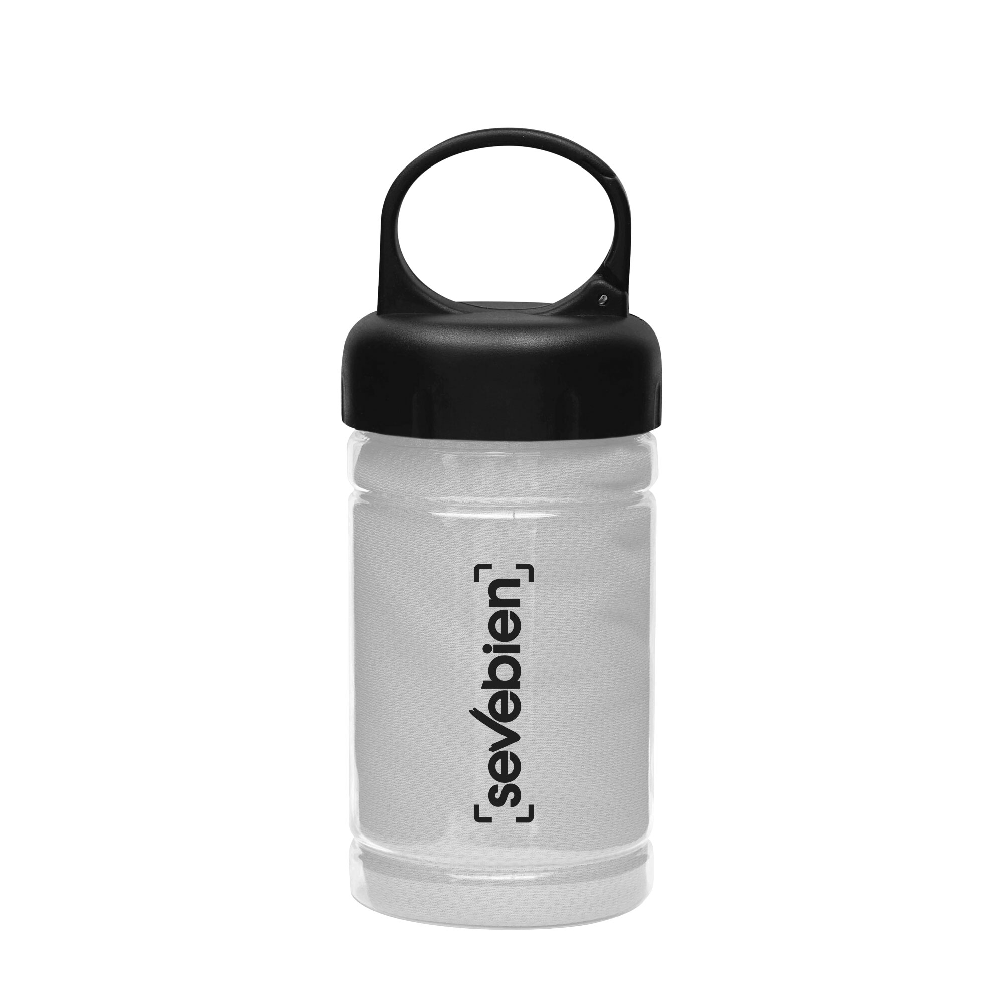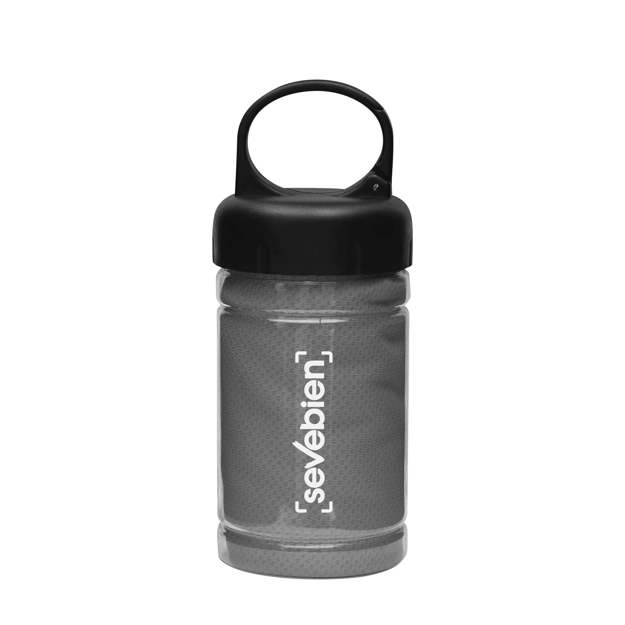 Medidas toalla 79 x 29 cm / Medidas frasco:  Ø6,5 x 17 cm. Políester. Toalla de enfriamiento en un estuche de plástico transparente. Para un efecto refrescante humedezca la toalla con agua o agregue agua en el cilindro e incorpore la toalla. Tapa a rosca con mosquetón.