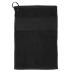 Toalla de golf con ojal metálico hecha de algodón de 400 gsm. Fabricada en algodón negro de alta absorción y suavidad, cuenta con un ojal con argolla metálica para colgar fácilmente en la bolsa de golf o cinturón. Es ideal para jugadores de golf que buscan mantener sus manos, palos o pelotas limpias y secas durante el juego.