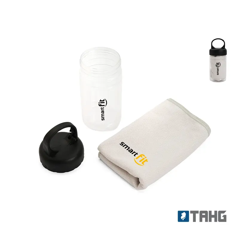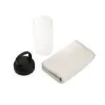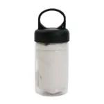 Toalla con estuche portátil. Fabricada en poliéster, PET y polipropileno. Cuenta con toalla de secado rápido (30 × 80 cm) y envase plástico con gancho incorporado para colgar o transportar fácilmente. Es ideal para entrenamientos, actividades al aire libre o viajes, gracias a su tamaño compacto y capacidad de secado rápido.