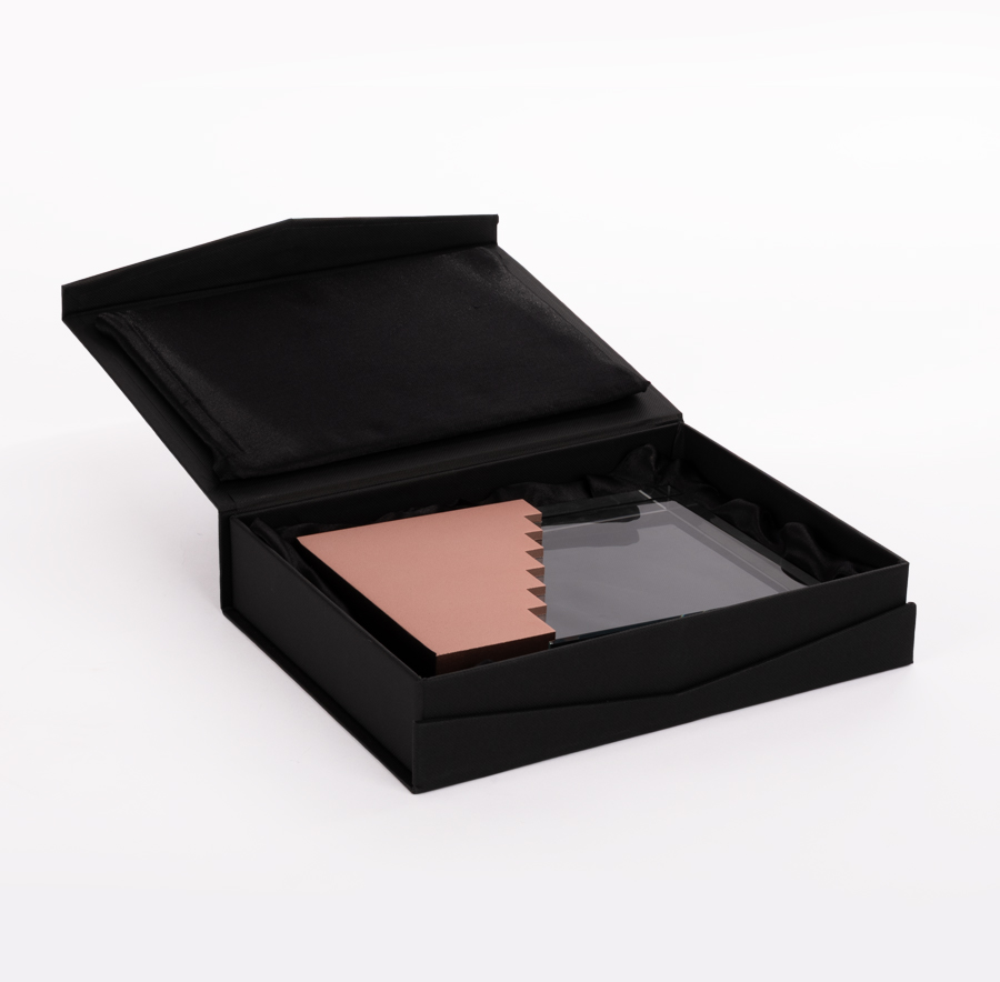 Elegante Trofeo de Cristal biselado con base metálica color cobre, modelo «Ladder». Presentación en caja de cartón forrado negro con cierre imantado, interior acolchado de espuma y tela poliéster satinado negro, con troquel.