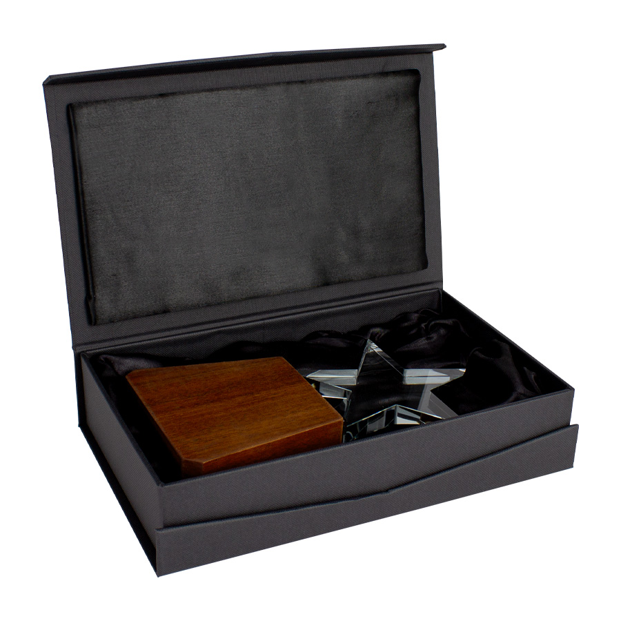 Elegante Trofeo modelo «Lonely Star», base de madera barnizada y estrella de cristal en su parte superior. Presentación en caja de cartón forrado negro con cierre imantado, interior acolchado de espuma y tela poliéster satinado negro, con troquel.