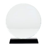 Elegante Trofeo Galvano redondo de Cristal modelo «Prisma», con base de cristal negro. Presentación en caja de cartón forrado negro con cierre imantado, interior acolchado de espuma y tela poliéster satinado negro, con troquel.