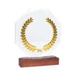 Elegante Trofeo modelo «Phelps», base de madera barnizada y cuerpo de cristal con hojas de laurel doradas en acero inoxidable. Presentación en caja de cartón forrado negro con cierre imantado, interior acolchado de espuma y tela poliéster satinado negro, con troquel.