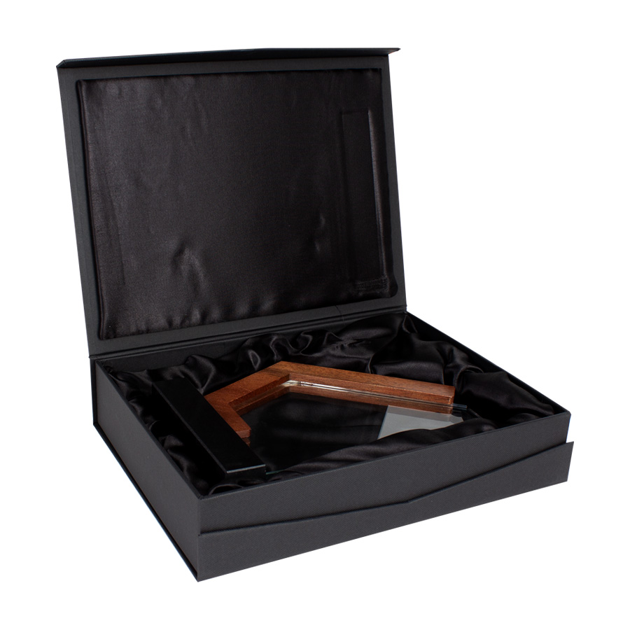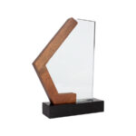 Elegante Trofeo modelo «Mercx», en madera barnizada y cristal, con base de mármol negro. Presentación en caja de cartón forrado negro con cierre imantado, interior acolchado de espuma y tela poliéster satinado negro, con troquel.