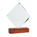 Elegante Trofeo modelo «Fischer», base de madera barnizada y cuerpo de cristal. Presentación en caja de cartón forrado negro con cierre imantado, interior acolchado de espuma y tela poliéster satinado negro, con troquel.