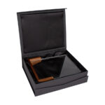 •Presentación: Caja de cartón forrado negro con cierre imantado, interior acolchado de espuma y tela poliéster satinado negro, con troquel.