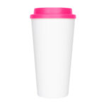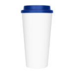 Vaso de polipropileno (PP) blanco doble pared, para líquidos fríos y tibios, con tapa rosca de color. Cuerpo cónico liso, para amplia impresión de logo. Producto BPA FREE, para el contacto con líquidos y alimentos. Capacidad 500ml. Presentación en caja de cartón color blanco.