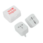 Adaptador de corriente universal, para conexión en cualquier tipo de enchufe al estar de viaje. Medidas: 5,7 x 5 x 4 cm.